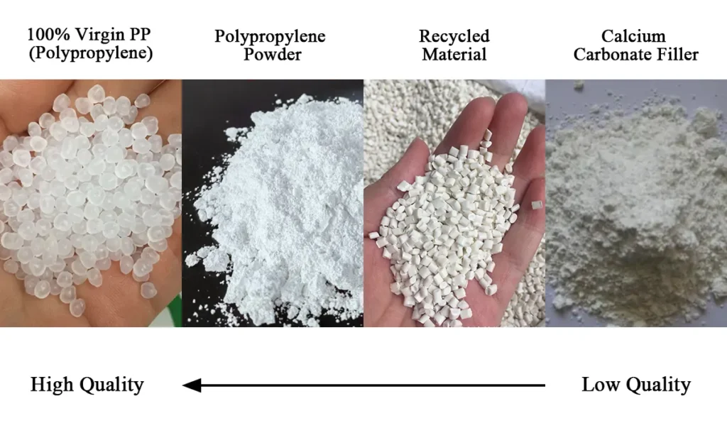100% Virgin PP (Polypropylene): Colorless and transparent or milky-white granules, uniform in size, and exhibiting excellent flowability. They possess an outstanding ratio of longitudinal to transverse tensile strength, high elongation at break, and yield a fabric surface that is soft and free of broken filaments..